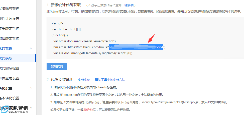 2、網站添加成功后,點擊右側獲取代碼,獲取網站的統計代碼,把獲取的代碼添加到網站后臺的統計里面或者添加到網站模版的foot里面,非mip的網站就到了就結束了,MIP站點繼續下一步
