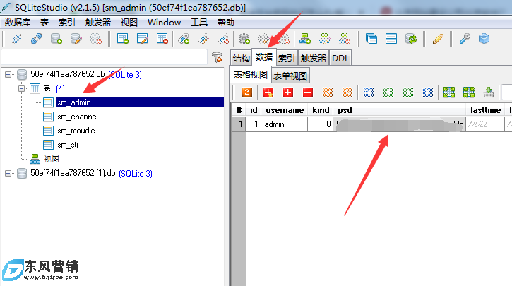 打開50ef74f1ea787652.db文件,選擇sm_admin》數據》替換psd值》保存