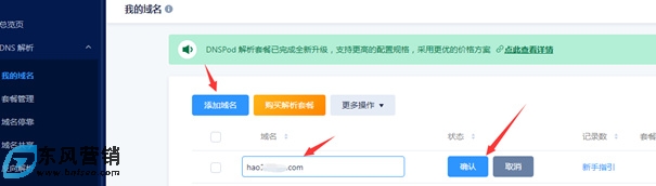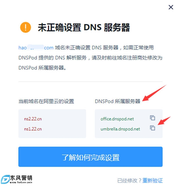 4、根據提示替換DNS,去域名管理替換掉原來的DNS