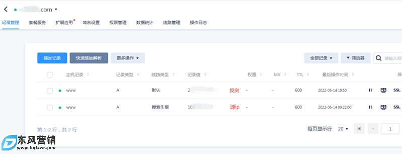 5、添加解析記錄,一條的線路類型選擇搜索引擎,也可以具體到百度還是搜狗等,記錄值填寫真實的服務器IP,如果網站做了反向代理,就在添加一條記錄,記錄值選擇反向代理服務器的IP