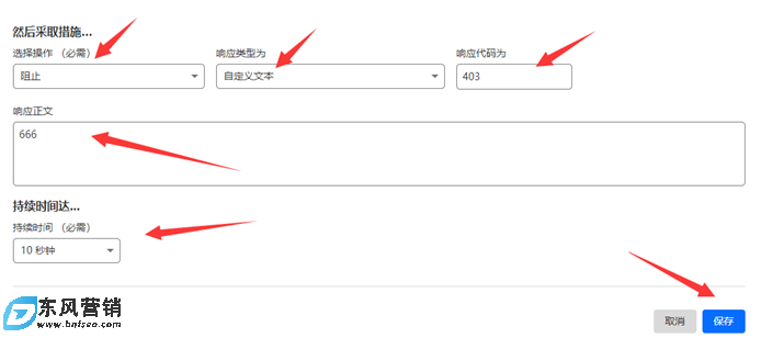 響應類型為 :默認 Cloudflare 速率限制響應(響應類型為 :默認 Cloudflare 速率限制響應,這會告訴訪問被阻止,跳轉到CF速度限制阻止頁面。如果您想告訴您的網站訪客發生了什么可以自定義HTML,利用UTF-8編碼自己寫個中文頁面。)